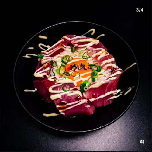 Pour les amateurs de poisson cru, notre Maguro Don est une véritable référence. Ce bol associe du thon cru de première qualité à un jaune d’œuf coulant, rehaussé par une sauce spéciale du chef et une touche de teriyaki. Quelques cébettes fraîches viennent compléter l’ensemble, apportant une note croquante et parfumée. Un plat raffiné qui met en valeur la richesse des saveurs japonaises, à déguster sur place ou à emporter.